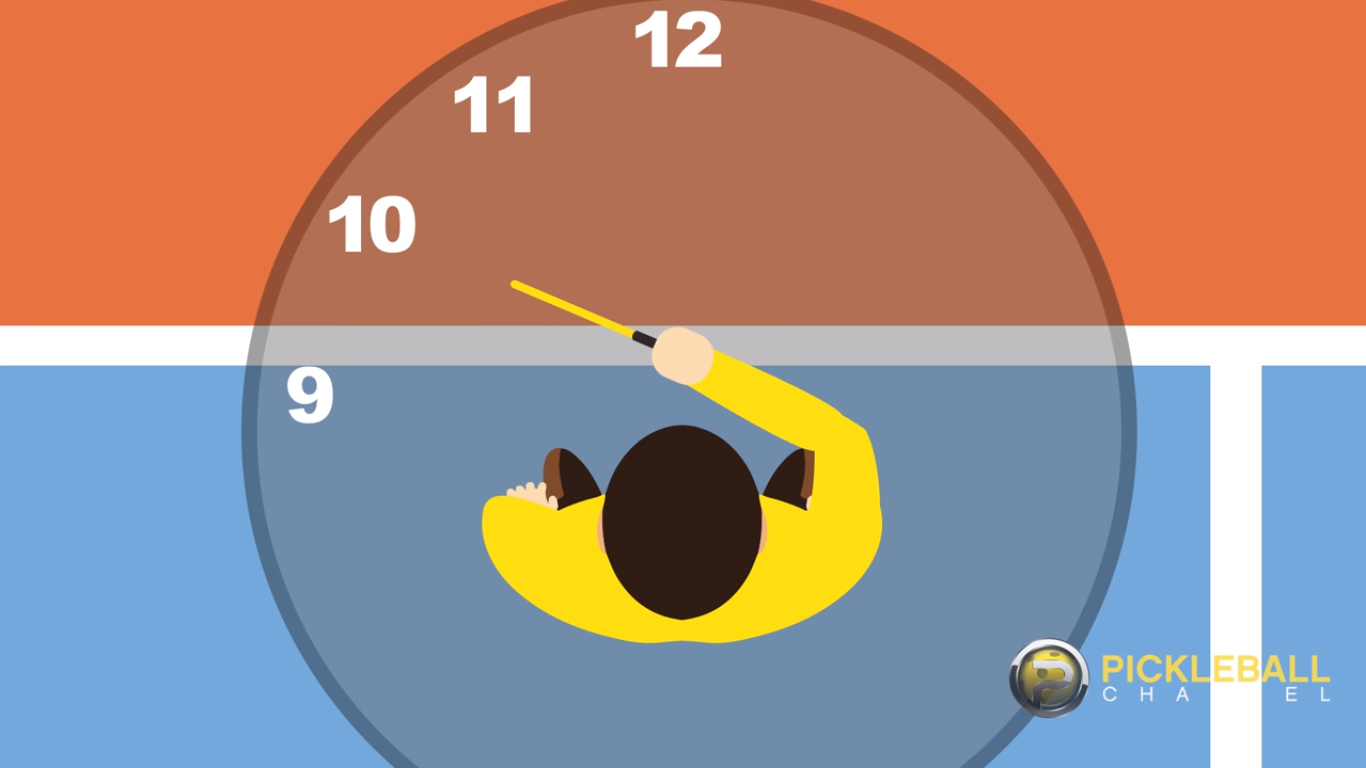 Simone calls the position on the right "the 9 o'clock" position. It also has a weakness - the volley at the paddle hand elbow. This position causes the elbow to flare out to form the dreaded "chicken wing". A ball aimed at the elbow is often hit by lifting the elbow and striking the backhand side with an open face. This causes the ball to be popped up.